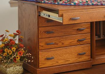 Another choice is an additional height option which raises the cabinet to 33½” or 35”. This makes the rear wing a comfortable place to use your rotary pad and cutter without risk of backache. When ordering the additional height option, the drawers automatically gain more depth in contrast to the standard-height cabinet.